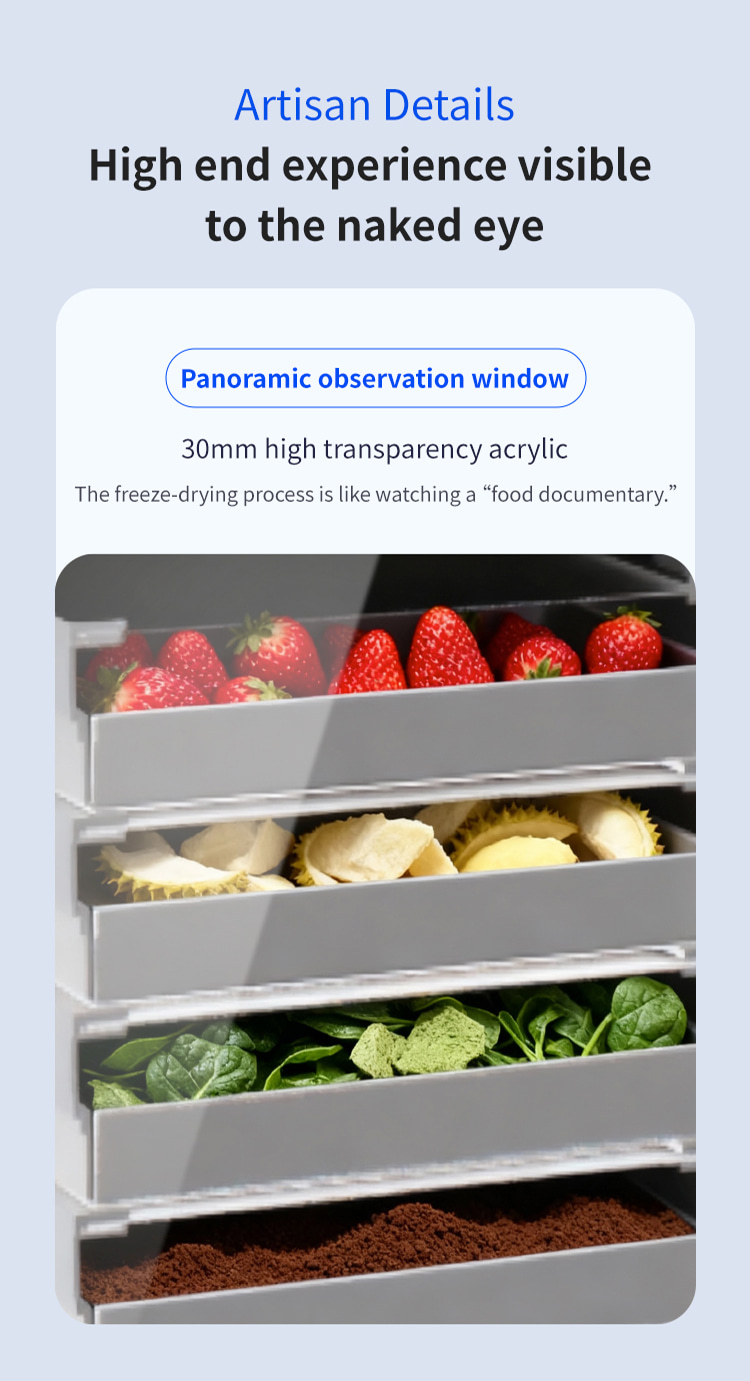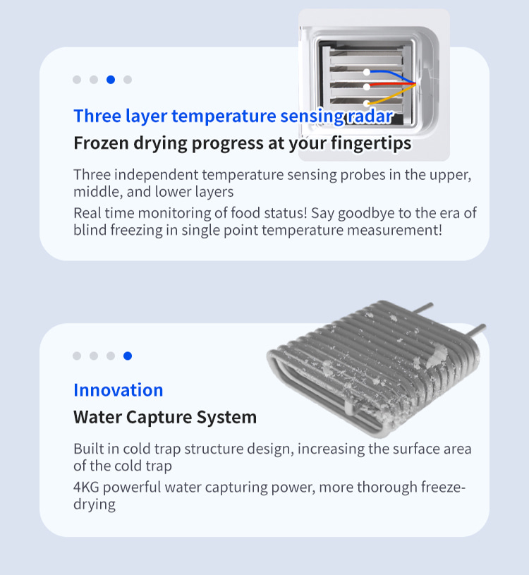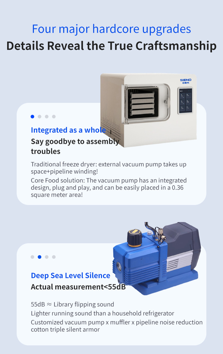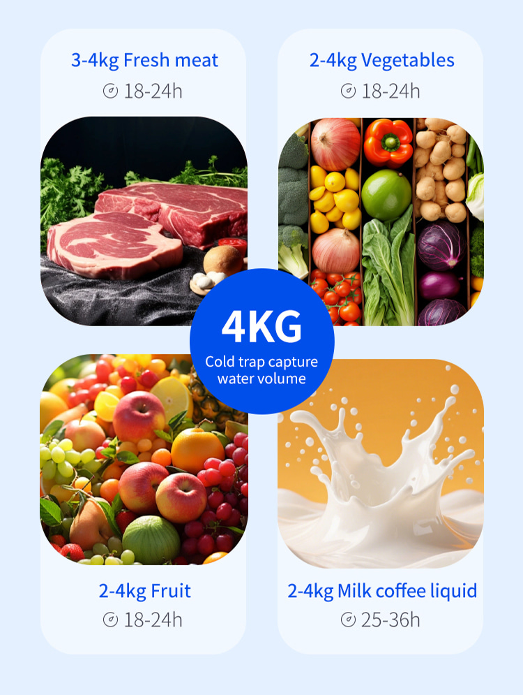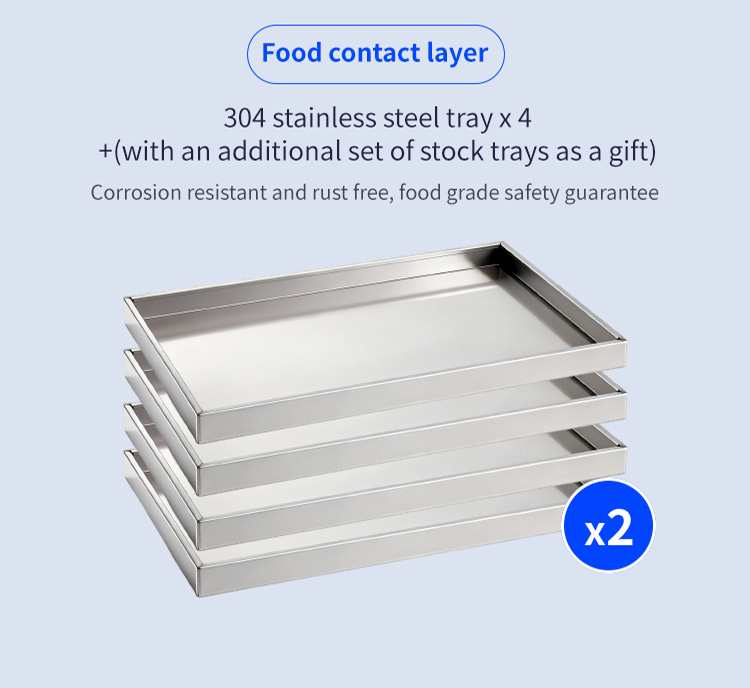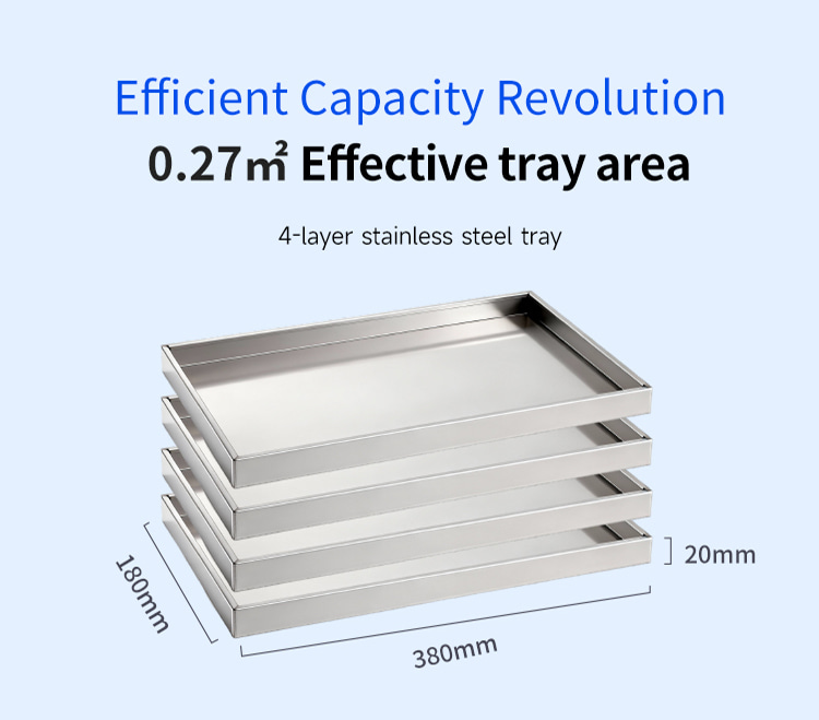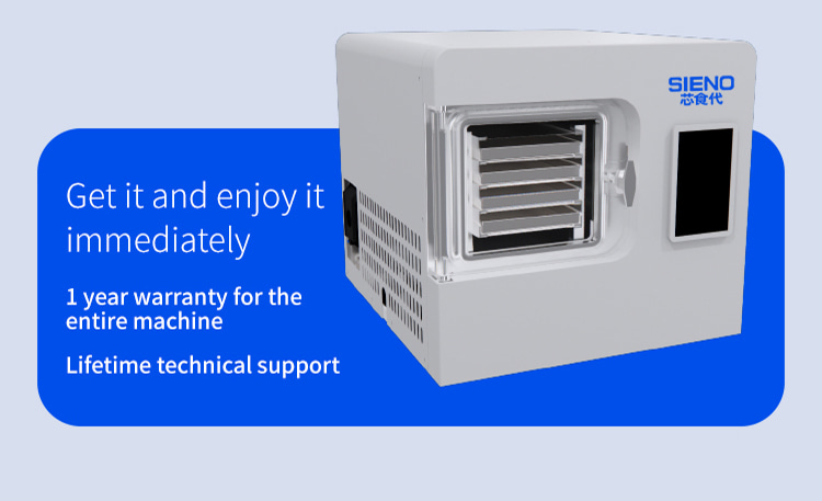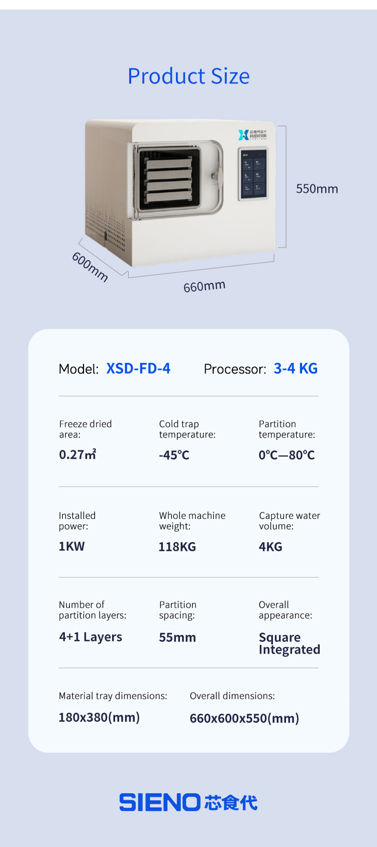 Model XSD-FD-4 Processor 3-4 KG Freeze dried area 0.27m2 Cold trap temperature -45°C Partition temperature 0°C—80℃ Installed power 1KW Whole machine weight 118KG Capture water volume 4KG Number of partition layers 4+1 Layers Partition spacing 55mm Overall appearance Square integrated Material tray dimensions 180x380(mm) Overall dimensions 660x600x550(mm)