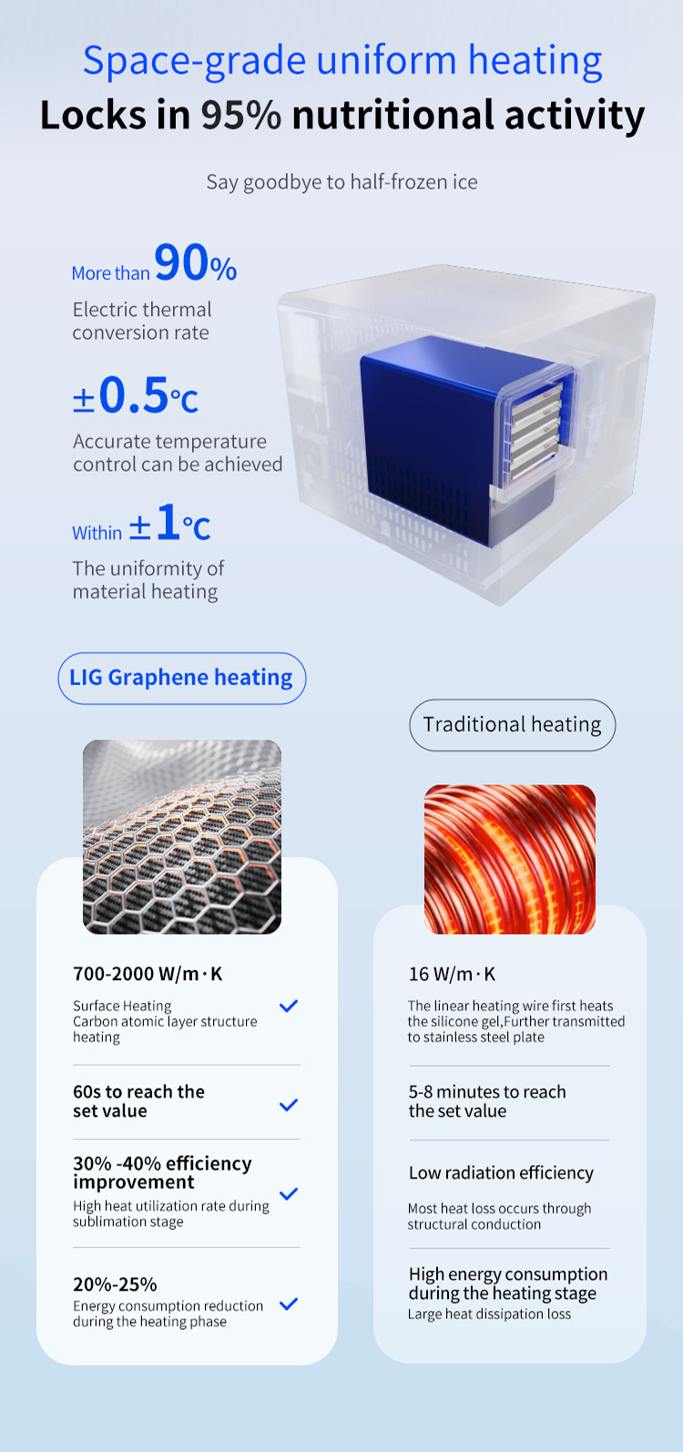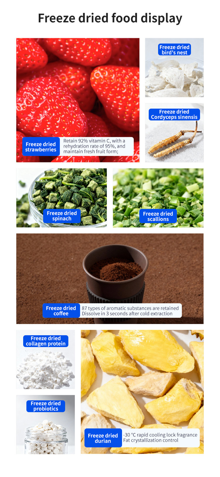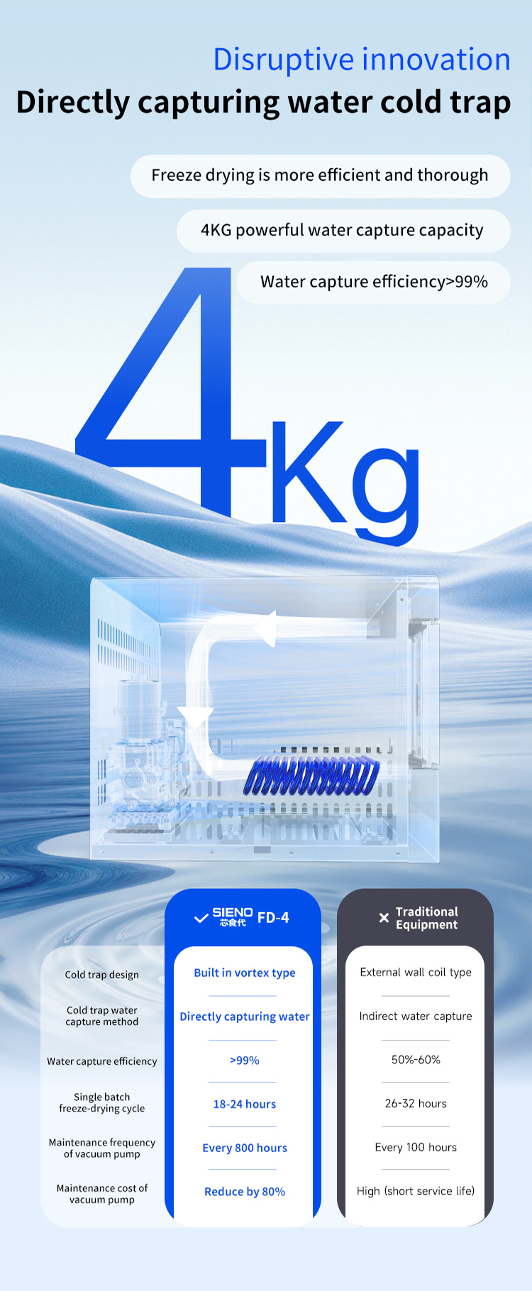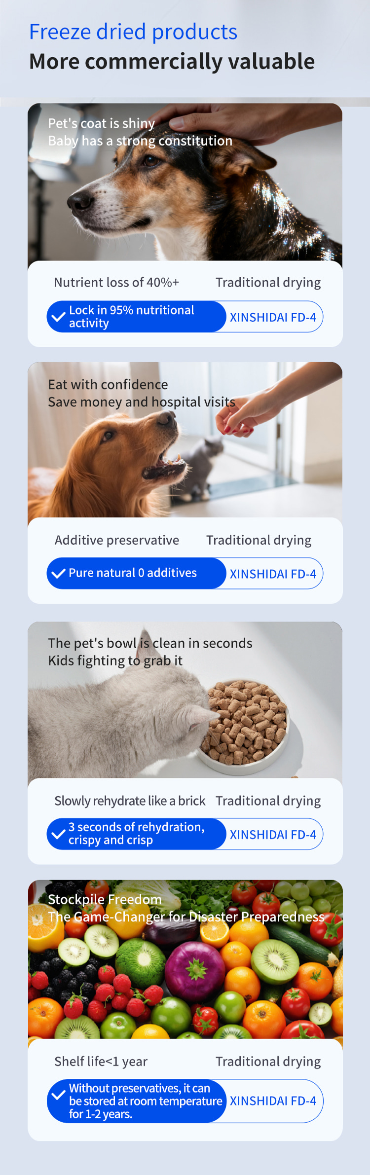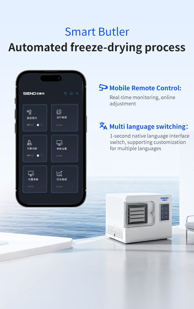 Model XSD-FD-4 Processor 3-4 KG Freeze dried area 0.27m2 Cold trap temperature -45°C Partition temperature 0°C—80℃ Installed power 1KW Whole machine weight 118KG Capture water volume 4KG Number of partition layers 4+1 Layers Partition spacing 55mm Overall appearance Square integrated Material tray dimensions 180x380(mm) Overall dimensions 660x600x550(mm)